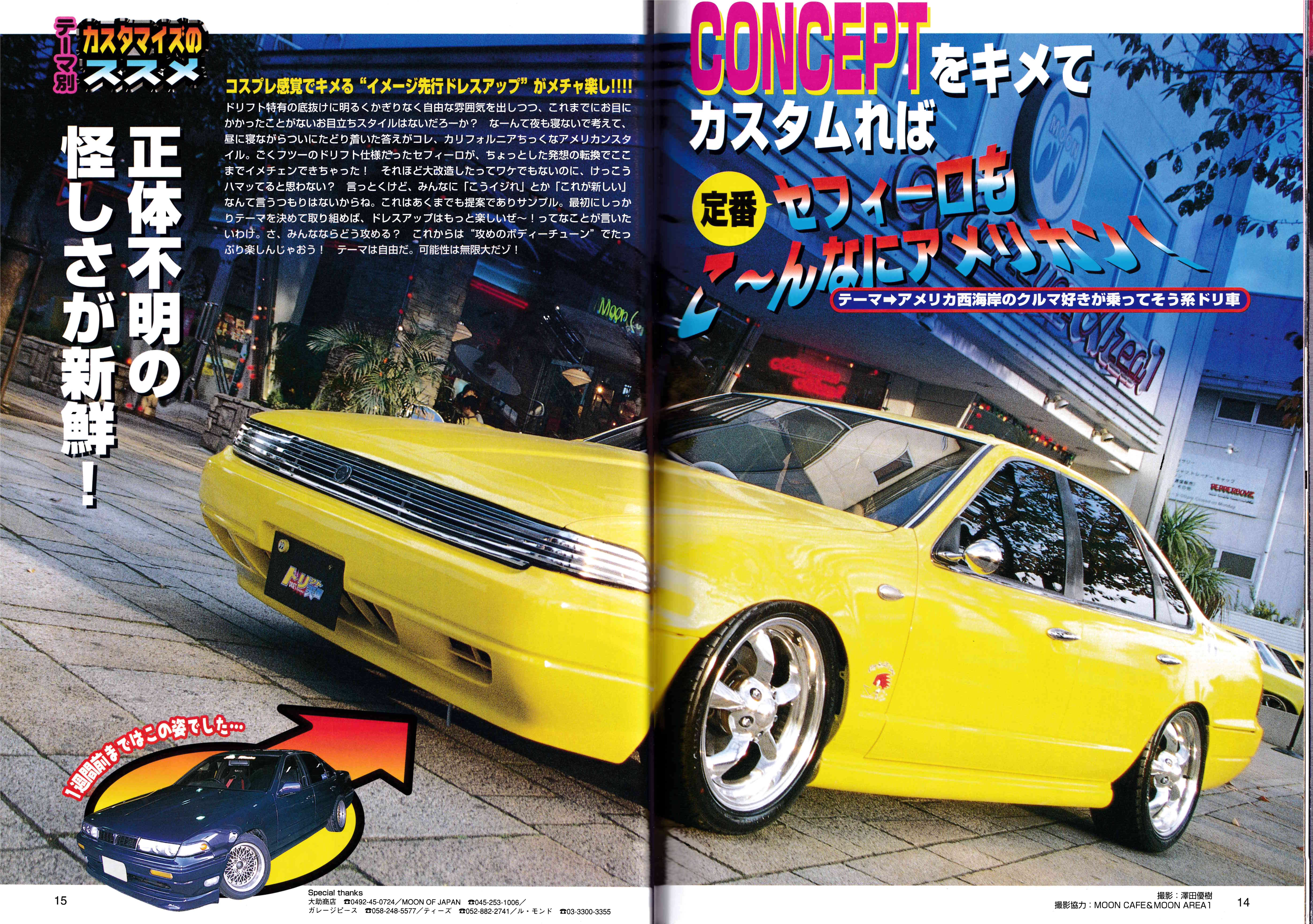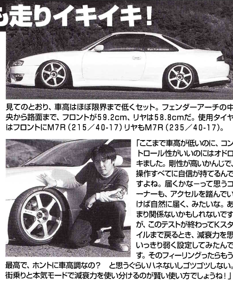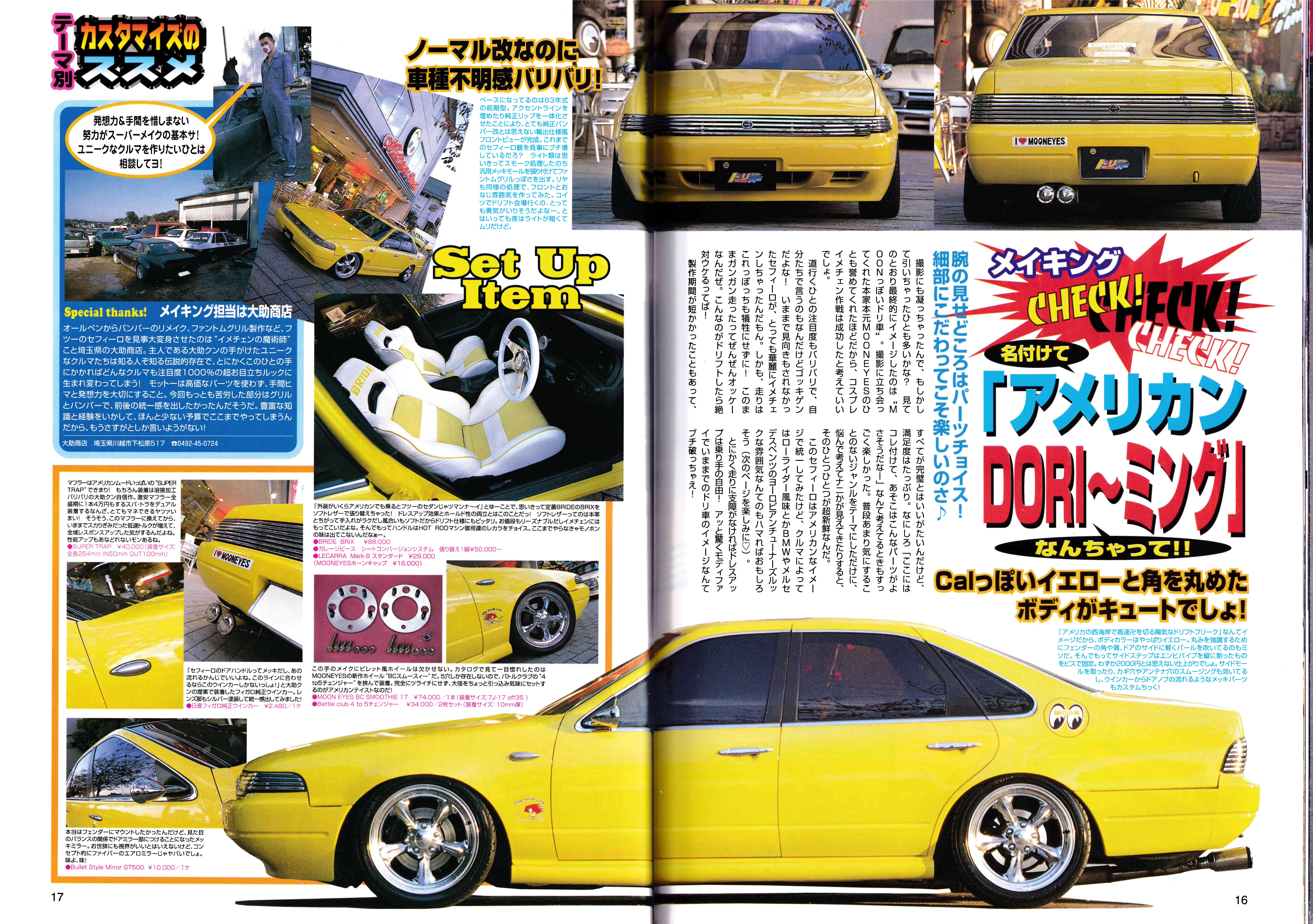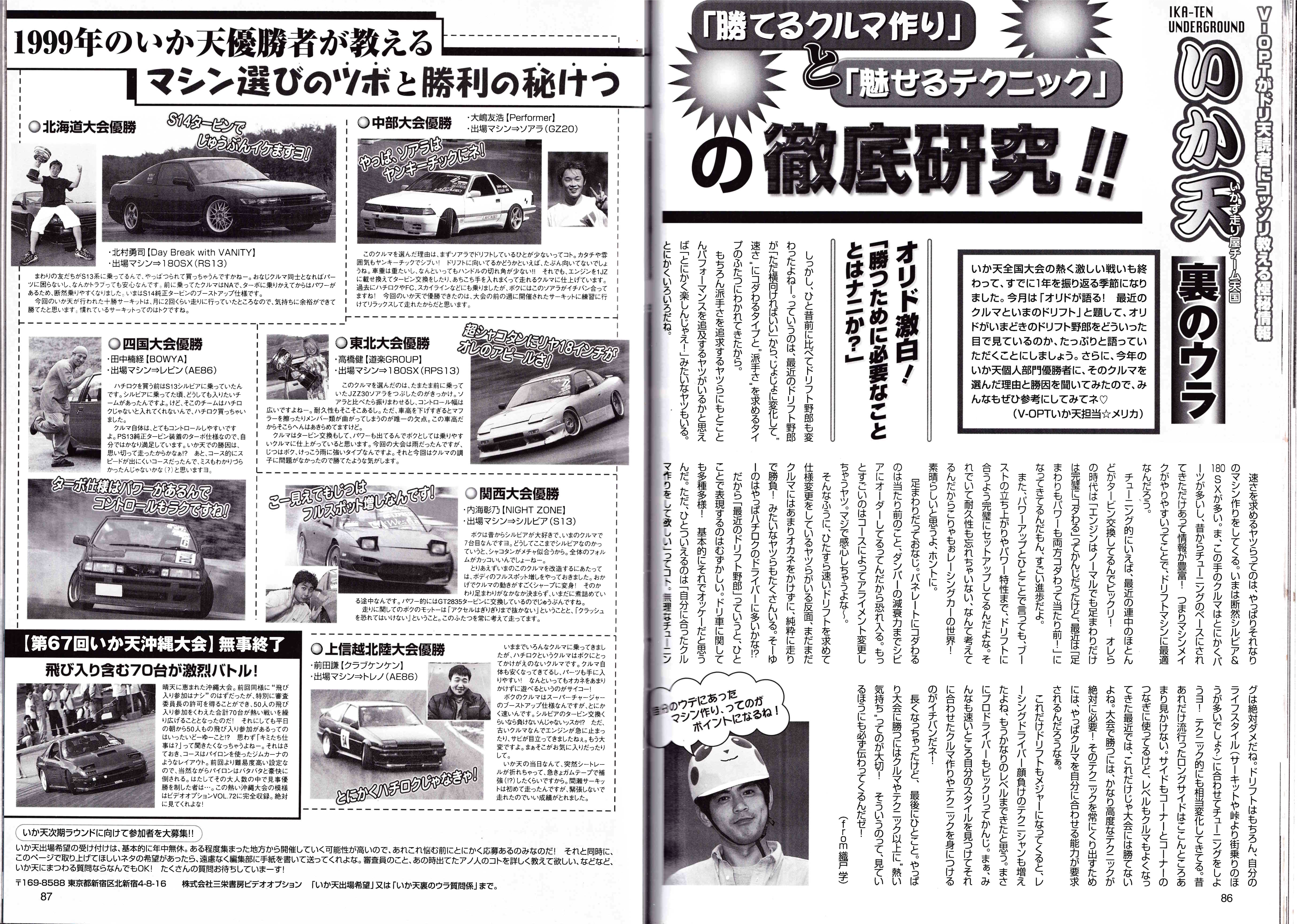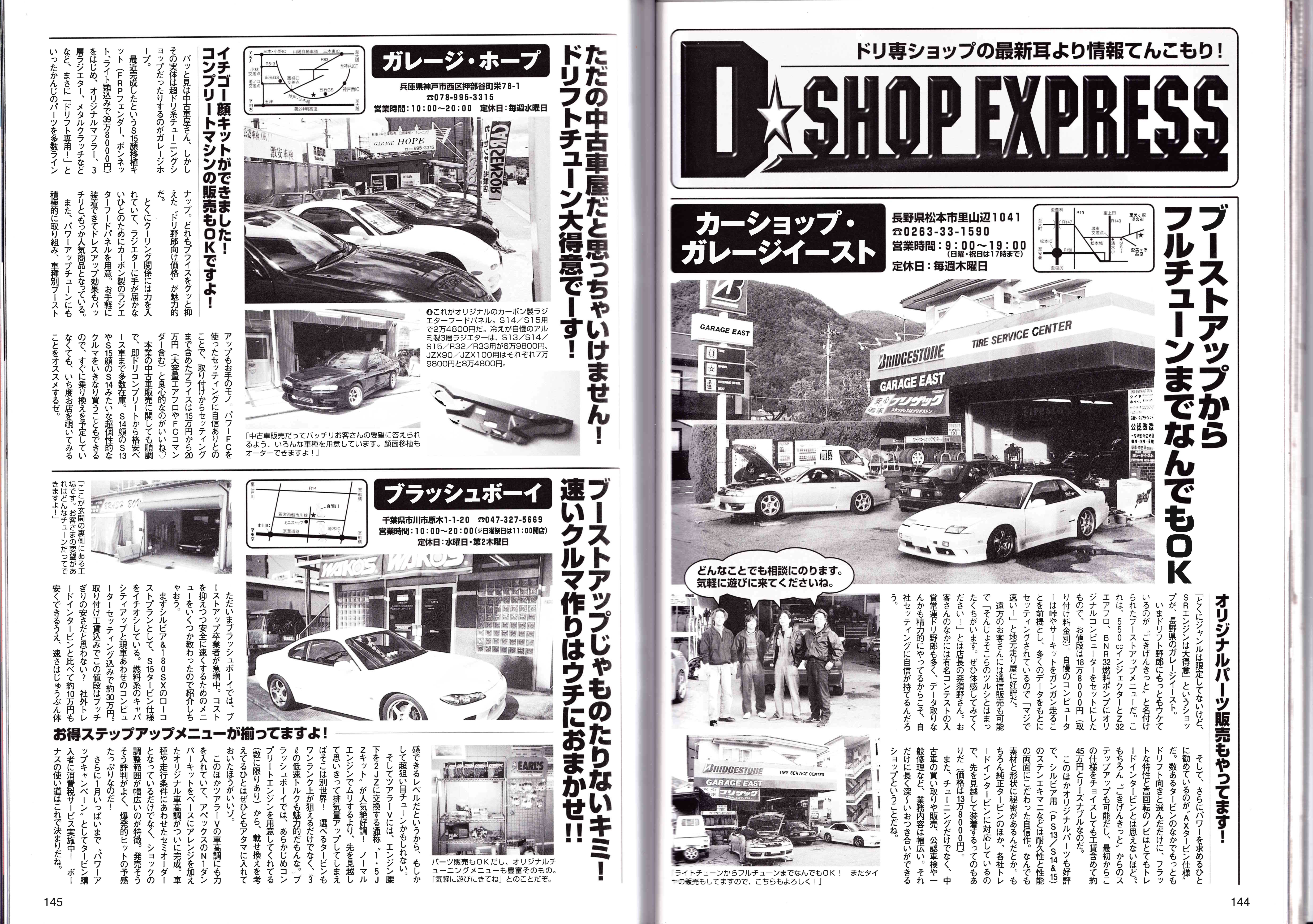 Car Shop Garage East: The main article on the right-hand side is about a shop called “Garage East” in Matsumoto City, Nagano Prefecture. The shop specializes in drift tuning and promotes their services, including turbo upgrades and full tuning. Parked upfront is a pretty cool Onevia and s14, mostly why I scanned this page.